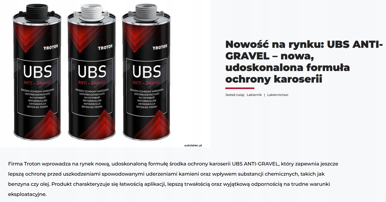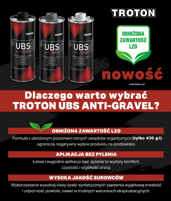W odpowiedzi na rosnące potrzeby rynku motoryzacyjnego, firma Troton wprowadza nową, udoskonaloną formułę środka ochrony karoserii UBS ANTI-GRAVEL. Produkt przeznaczony jest do zabezpieczania powierzchni samochodowych przed uszkodzeniami mechanicznymi oraz działaniem agresywnych substancji, takich jak oleje, woda, czy sól drogowa. Co wyróżnia tę nowość na rynku? Zwiększona efektywność oraz lepsza odporność na trudne warunki eksploatacyjne.