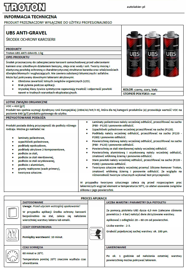 Dzięki wyjątkowym właściwościom oraz udoskonalonej formule, UBS ANTI-GRAVEL staje się niezastąpionym produktem dla profesjonalistów zajmujących się naprawą i ochroną karoserii samochodowych. Nowość na rynku, która spełnia wszystkie normy Unii Europejskiej, w tym wymogi dotyczące zawartości VOC, daje pewność, że produkt jest zgodny z najnowszymi regulacjami ekologicznymi.