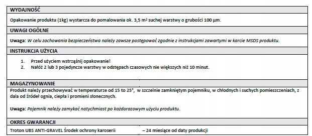 UBS ANTI-GRAVEL to także wysoka trwałość, nawet w ekstremalnych warunkach użytkowych. Dzięki zastosowaniu wysokiej jakości żywic syntetycznych, powłoka ochronna jest odporna na działanie czynników atmosferycznych oraz mechaniczne uszkodzenia. Możliwość pokrycia powłoki dowolnymi lakierami akrylowymi zapewnia szeroką elastyczność w pracach lakierniczych.