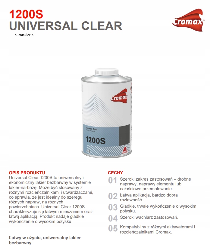 1200S marki Cromax to uniwersalny i ekonomiczny lakier bezbarwny do pokrywania baz lakierniczych.