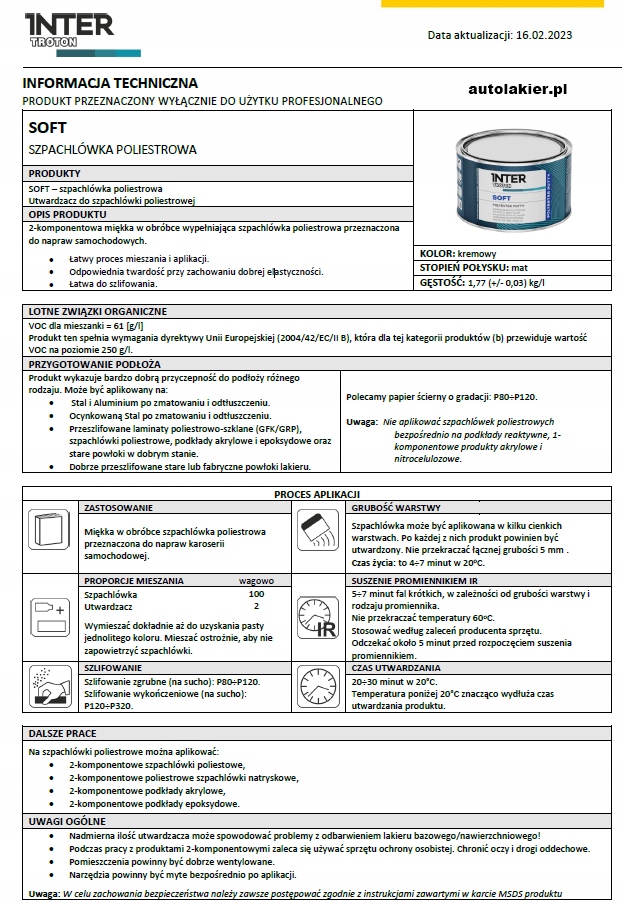 Uwaga: Nie aplikować szpachlówek poliestrowych bezpośrednio na podkłady reaktywne,1-komponentowe produkty akrylowe i nitrocelulozowe.