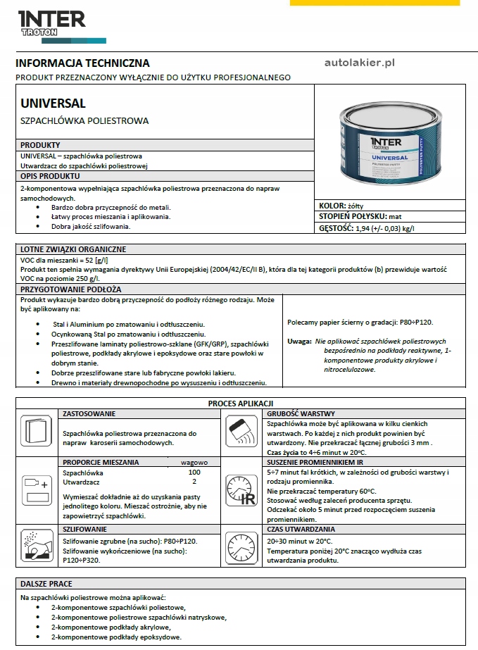 Uwaga: Nie aplikować szpachlówek poliestrowych bezpośrednio na podkłady reaktywne, 1-komponentowe produkty akrylowe i nitrocelulozowe.