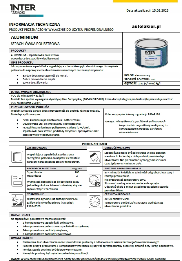 Uwaga: Nie aplikować szpachlówek poliestrowych bezpośrednio na podkłady reaktywne, 1-komponentowe produkty akrylowe i nitrocelulozowe.